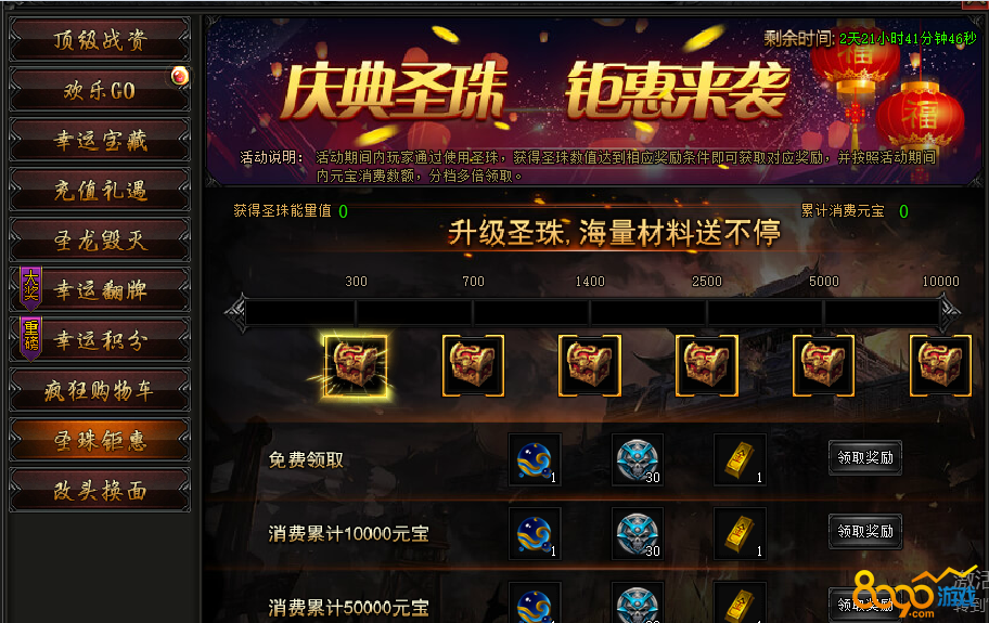 活动内容:活动期间内,使用圣珠,消费元宝,即可有大量圣珠返还。