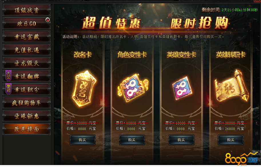 活动内容:活动期间,限时推出改名卡,人物/英雄变性卡和英雄转职卡,每个道具仅可购 买一次。