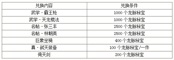 活动期间,玩家使用龙脉宝箱开出的龙脉秘宝,可兑换多种s珍稀大奖。