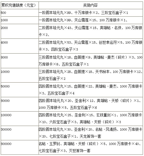 活动期间,累计充值金额满足一定数额条件,便可领取丰厚奖励。