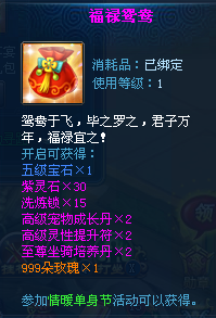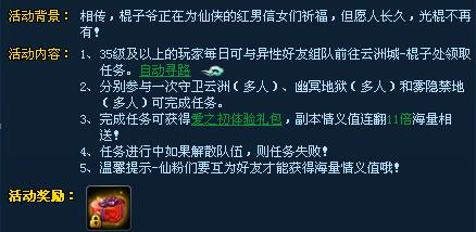 【活动内容】:每日35级以上的玩家可在云洲城光棍节活动使者处接任务,与异性玩家组队参与每个多人副本一次可完成任务。好友组队情义值翻11倍。