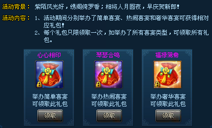【活动内容】:在光棍活动结束前举办了简单、热闹和奢华喜宴,可以获得相对应的礼包。礼包只限领一次。