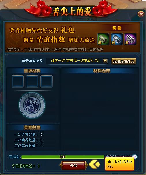 【活动内容】:每日可在云洲城NPC仙侠神锅处(162,258)做3次不同难度等级的菜肴给异性好友,可获得礼包及双方获得大量情义值。