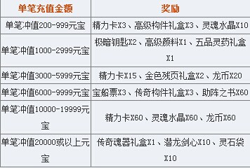 活动规则:活动期间,每日累计充值满200元宝即可领取精力卡X5,多充多得!(例如当天充值满1000元宝,即可领取5次奖励,但每日最多能领取10次奖励,次日活动状态将会重置)