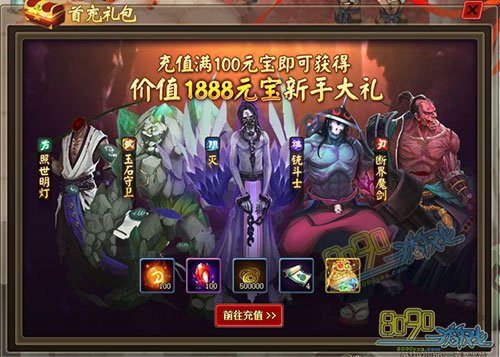 活动内容:充值满100元宝即可获得价值1888元宝的新手福利大礼包。