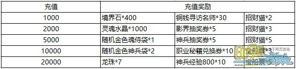 活动内容:活动期间,累计充值满20000元宝,每多充1000元宝赠送100元宝。