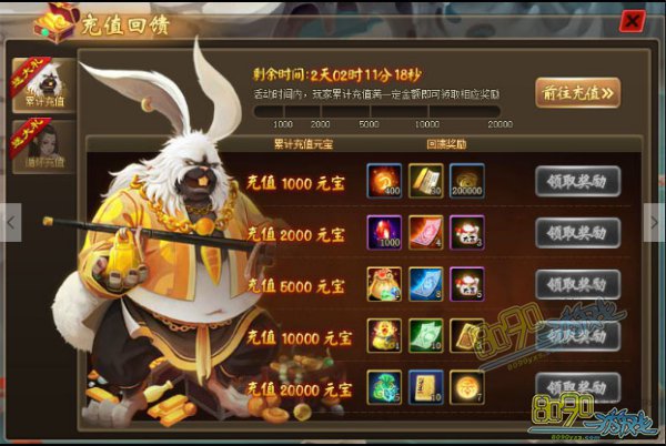 活动内容:活动期间,累计充值满20000元宝,每多充1000元宝赠送100元宝。