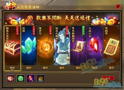 活动内容:玩家创角后的七天内,玩家每天上线都能在“登录奖励”中获得丰富道具及元宝奖励。