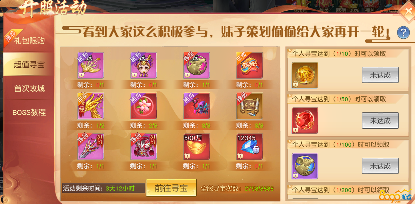 开服前7天,装备寻宝开启超值寻宝活动,活动时间内,全服前8888次寻宝将有额外超值奖励。