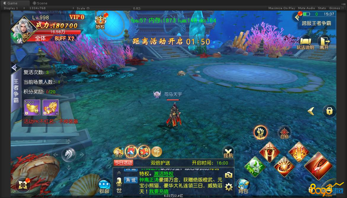王者争霸活动共有2个阶段,活动前5分钟为第一阶段,玩家自由PK,无限复活,击杀其他玩家可获得积分。5分钟后为第二阶段,玩家只有3次的复活机会,复活机会全部用完之后就会淘汰,直至场上只剩最后一个玩家。
