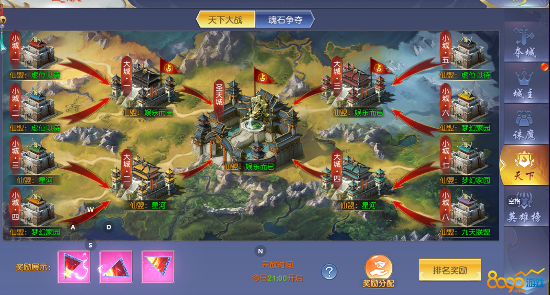 搜索"8090网页游戏"仙侠神域这款以仙侠冒险为主题的游戏,四种职业任意选择,十四张大地图任意传送,构建唯美仙侠世界,有很多小伙伴都想知道仙侠神域天下大战怎么玩?仙侠神域天下大战能获得哪些奖励?感兴趣的小伙伴一起来了解一下吧!
