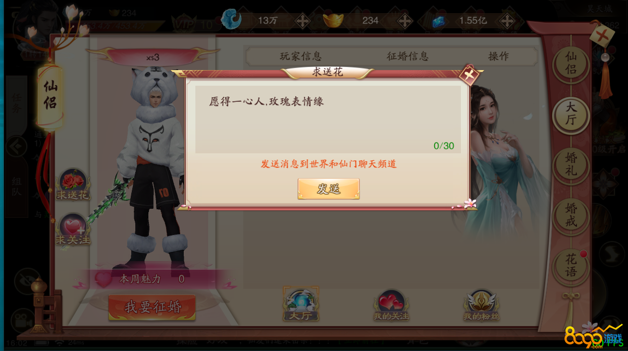 在游戏中,结婚系统可以帮助玩家寻找到游戏伙伴,首先玩家可以前往大厅,发布征婚的消息,也可以在大厅中去找那些要征婚的人,互相关注,赠送鲜花,提高好感度,然后婚礼的话,可以选择不同的档次,实现玩家的梦想,不同的场次,那么价格肯定也是不一样的,之后互赠鲜花,会获得对应的属性,还能激活相应的称号,结完婚之后,就可以成为仙侣获得加成属性了,还可以夫妻组队刷仙侣试炼。