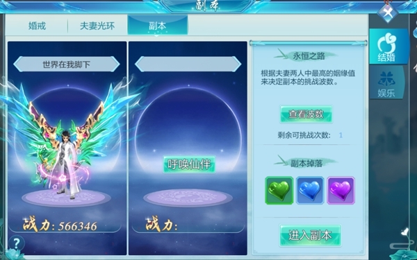 当玩家结婚之后,就可以进入夫妻特点副本,然后就可以换取大量的奖励,玩家可以一个人进入到副本中,也可以叫伴侣来帮忙,副本只会消耗队长的挑战次数,不会消耗队员的挑战次数,但是掉落的奖励只有队长可以获得,玩家召唤伴侣参加永恒之路的话,可以增加相应的姻缘值,当夫妻的姻缘值越高,你可以挑战的副本次数就越多,每天的6点钟会刷新挑战次数。