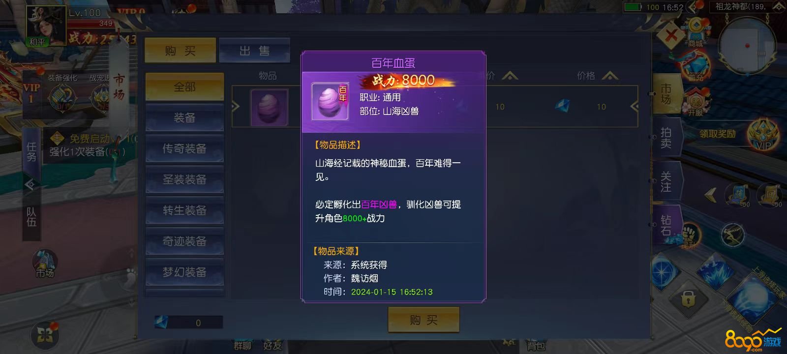 在游戏仙侠神域中,百年血蛋是一种特殊的道具,它可以孵化出凶兽,增加玩家的战斗力。