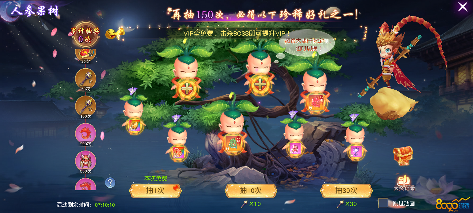 人参果树活动提供的奖励是特戒水晶。在一定次数的抽取后,可以保证获得特定的大变异或小变异。