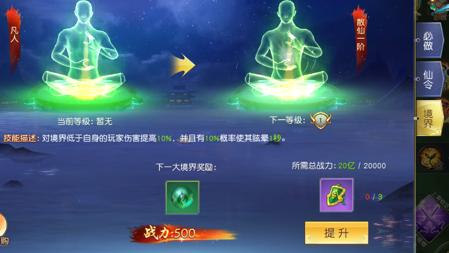 在《仙侠神域》的世界里,境界是衡量一个玩家实力的重要指标。玩家可以通过消耗境界令牌来逐步提升自己的境界。当玩家在与其他玩家对战时,如果自身的境界高于对手,那么就能对低境界的玩家造成额外的10%伤害,这无疑为玩家在PK中提供了不小的优势。
