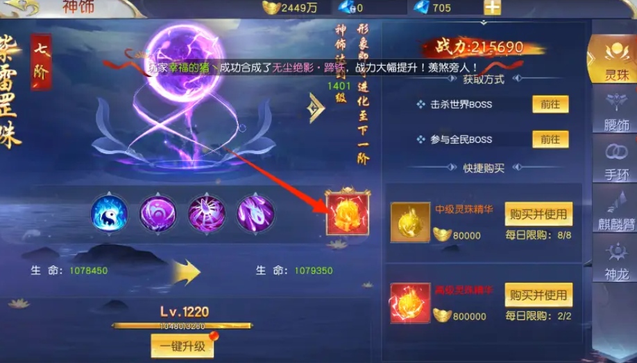 2. 购买灵珠,腰饰,翅膀: 这三个器魂虽然不如前三者那么重要,但同样也对角色的战斗力有所提升。灵珠可以增加角色的防御能力,腰饰提供额外属性加成,而翅膀则增加角色的移动速度和飞行能力。