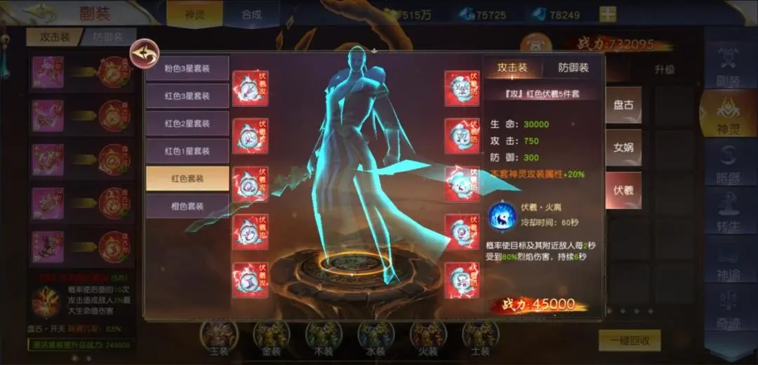 伏羲套装:该套装触发烈焰伤害效果,为神灵攻击装备增加20%的属性。伏羲套装适合那些追求稳定伤害输出的玩家。
