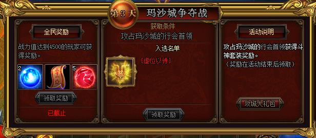 活动时间:开服第3天至有行会首次占领玛沙城。