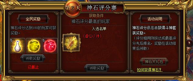 活动详情:活动截止时,服务器中神石评分最高的玩家将获得斗神套装奖励【斗神手镯】;神石评分达到180的玩家可以获得全民奖励。