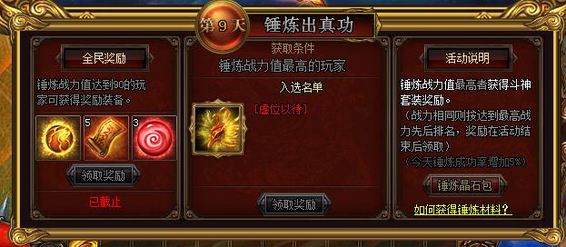 活动详情:活动截止时,服务器中锤炼战力最高的玩家将获得斗神套装【斗神腰带】;锤炼战力达到90的玩家可获得全民奖励。