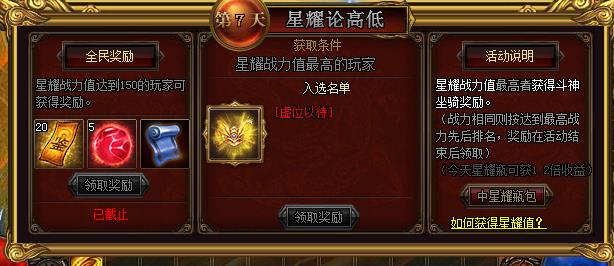 活动详情: 活动截止时,服务器中星耀战斗力最高的玩家将获得斗神套装奖励【斗神腰带】;星耀战力值达到150的玩家可以获得全民奖励。