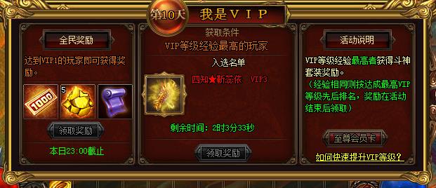 活动详情:活动截止时,服务器中VIP等级经验最高的玩家将获得斗神套装奖励 【斗神勋章】,VIP等级达到VIP1的玩家可获得全民奖励。