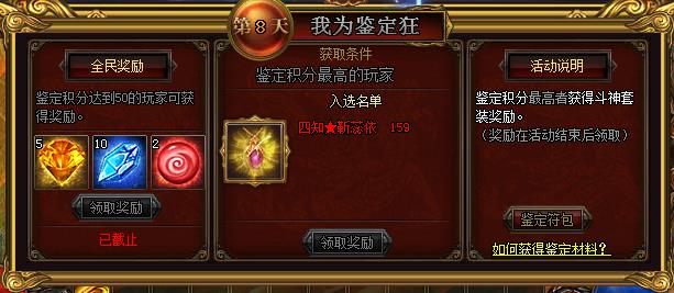 活动详情:活动截止时,服务器中鉴定积分最高的玩家将获得斗神套装奖励【斗神项链】;鉴定积分达到50的玩家可以获得全民奖励。