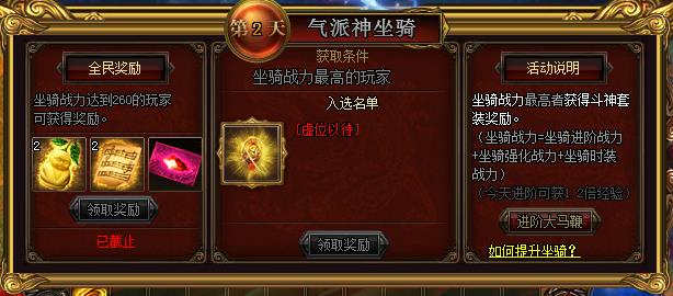 活动详情:活动截止时,服务器中坐骑战力的玩家将获得斗神套装奖励【斗神勋章】;坐骑战力达到260以上的玩家可以获得全民奖励。