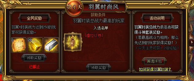 活动详情:活动截止时,服务器中羽翼和时装总战力最高的玩家将获得斗神套装奖励【斗神战靴】;羽翼+时装战力达到250的玩家可以获得全民奖励。
