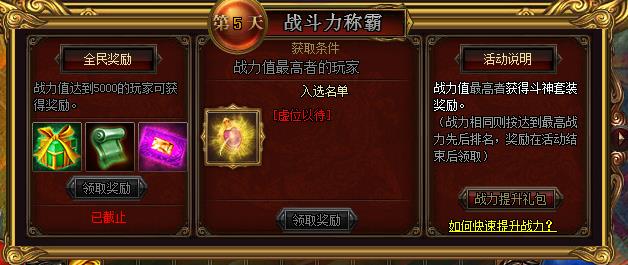活动详情:活动截止时,服务器中战力排名第一的玩家将获得斗神套装奖励【斗神宝石】;战力达5000的玩家可以获得全民奖励。