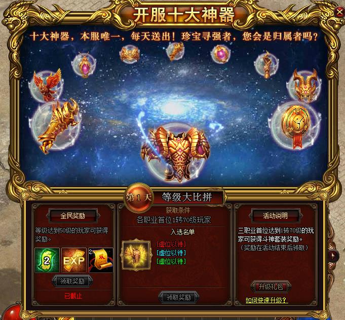 活动详情:活动结束前,每个职业首个角色等级达到1转70级的玩家,都可获得斗神套装奖励【斗神战甲】,开服第一天等级达到50级的玩家都可获得全民奖励。