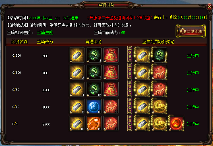 坐骑战力1800:绑定金条(小) *5、3级装备升级石*10、进阶马鞭*30