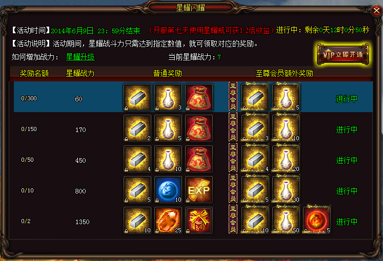 活动内容:在活动期间,星耀战斗力只需达到指定数值,就可领取对应的奖励。名额有限先到先得!