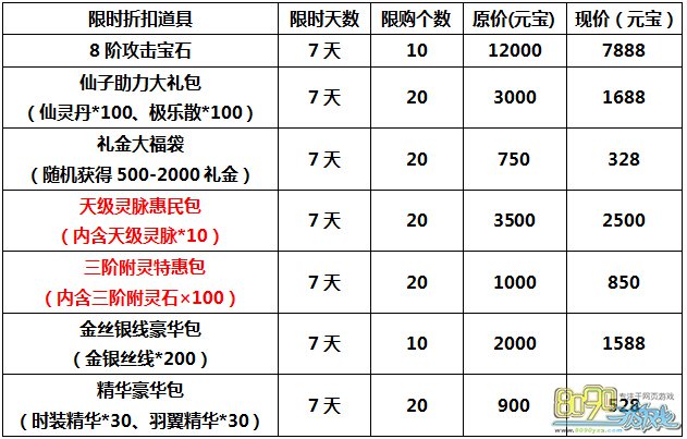 活动内容:活动期间,龙宫限时售卖特价礼包,详情见下表。