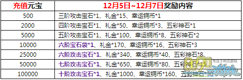 活动内容:活动期间,玩家3日累计充值即可获得相应奖励,每档奖励只可领取1次