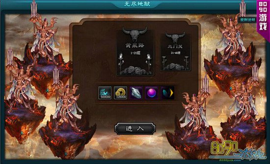 传说中地狱共有十八层,罪孽越多,下的层数越深,现在8090西游伏魔独创无尽地狱特色PVE系统,你是否赶前来一战呢?“黄泉路”,“鬼门关”,“忘川河”三关,每关有进入等级限制,每关有20层,每5层一个Boss,每个Boss有若干个守卫,先击杀守卫可以削弱Boss,击杀Boss有丰厚的奖励,奖励物品包括经验,铜钱,白银精华,升星石,附灵石,橙光石。最低等级战胜关卡全部5星难度Boss的玩家可以成为该关卡的守护者。