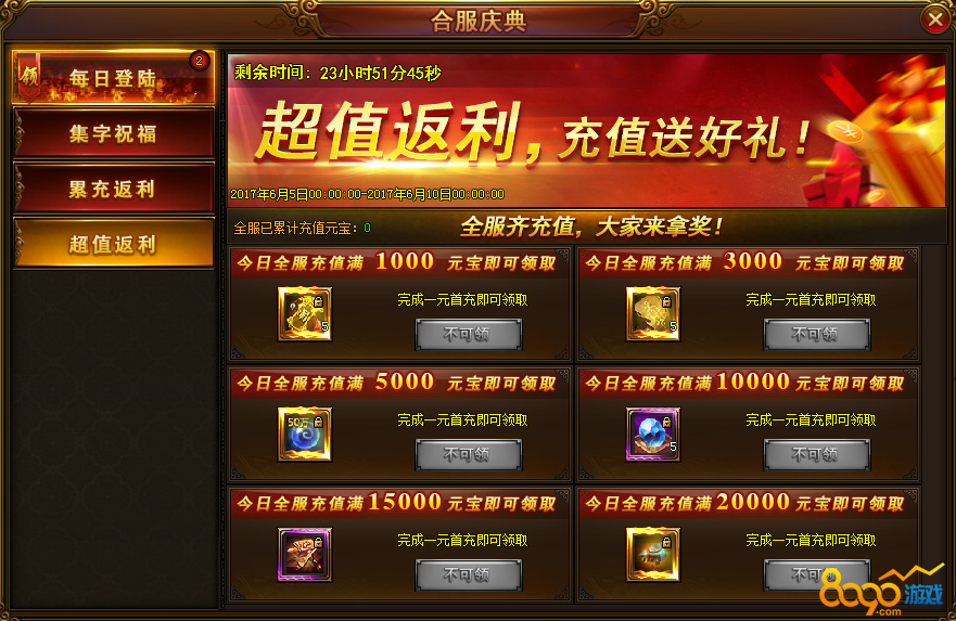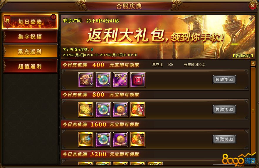 活动内容:活动期间,每天累计充值达到一定的元宝,即可领取相应的奖励。