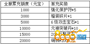 活动内容:活动期间,每天全服累计充值到一定的元宝数,并且个人任意充值一笔,即可领取大奖。