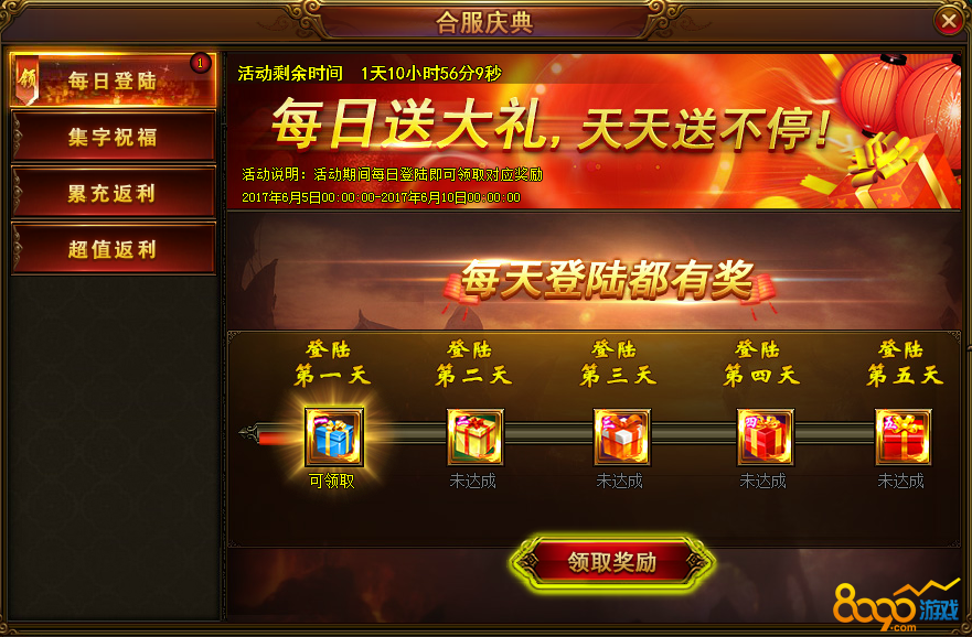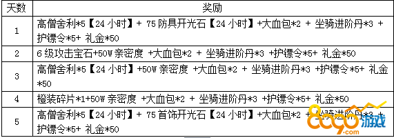 活动内容:合服后每天登陆游戏,即可领取登每日合服登陆礼包