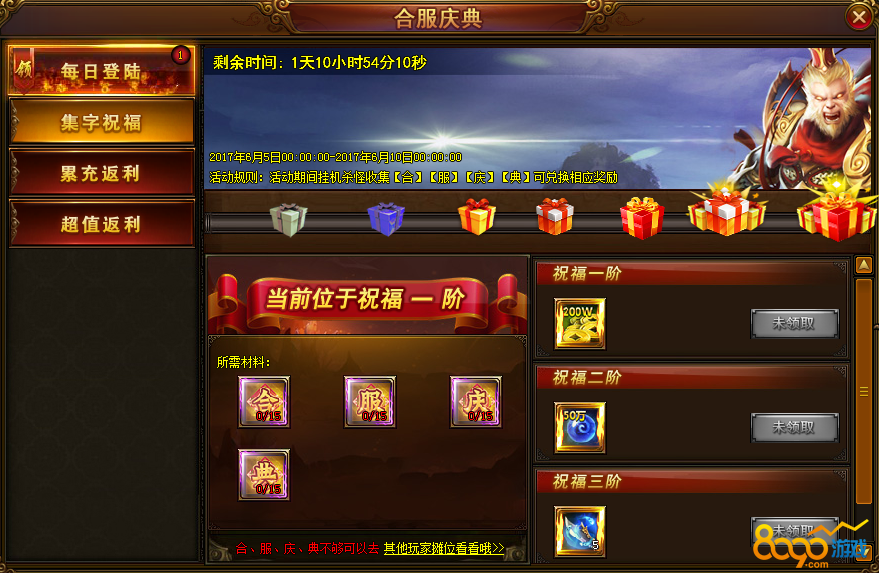 活动内容:活动期间,每天挂机可以收集合服庆典 几个字,可以段欢相应的奖励,还可以摆摊购买获得,挂机掉落每天有最大上限值(300)。