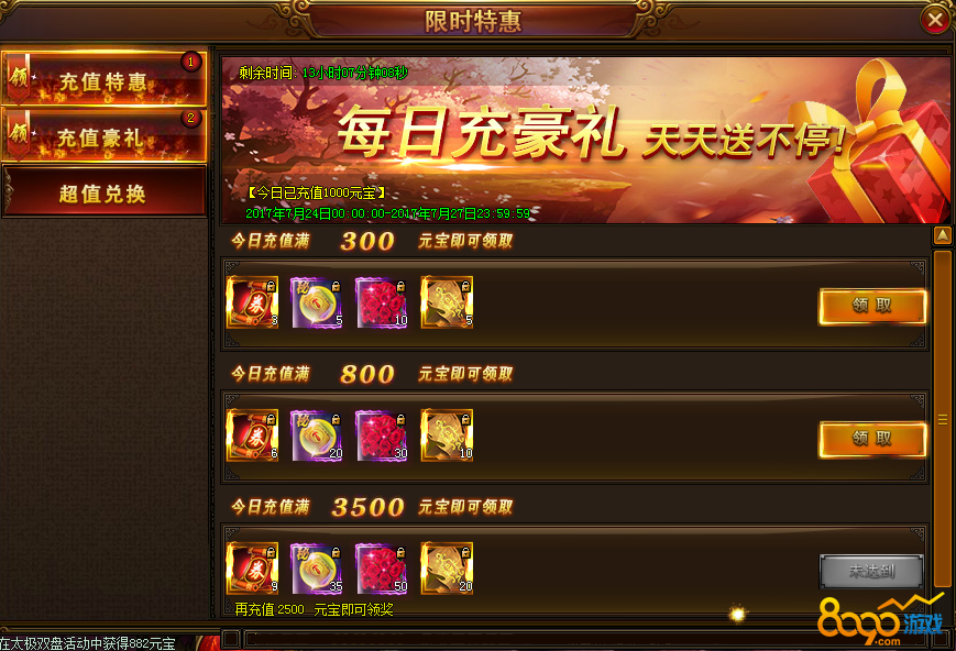 2. 活动时间内每天累计充值达到一定数额都可领取对应奖励