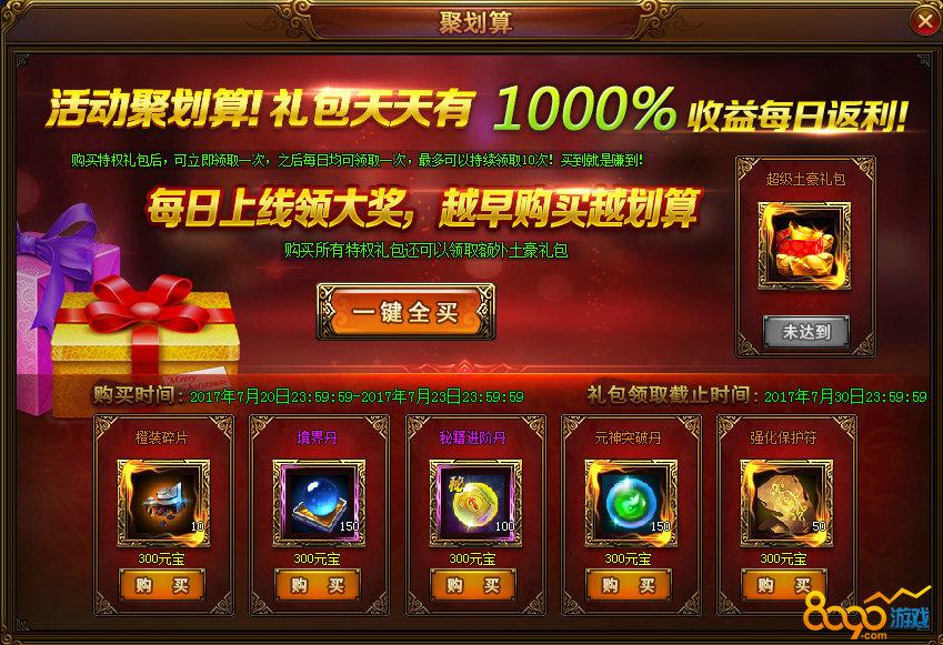 3. 第一天之后购买特权礼包的仍然可以领完全部的每日奖励,以上线后弹窗方式领取,比如在活动最后一天购买了全部特权礼包,当天可领取1次所有特权礼包和1个超级土豪礼包,第二天虽然活动结束,图标没有了,但是可在上线时弹出的弹窗内领取每天的特权礼包,直到领完
