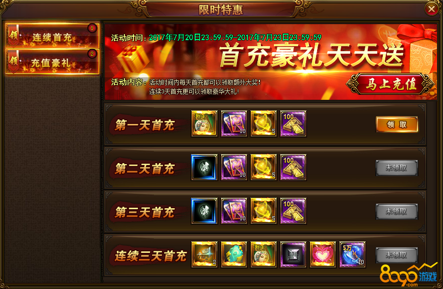 5. 连续3天首充可领取豪华大奖