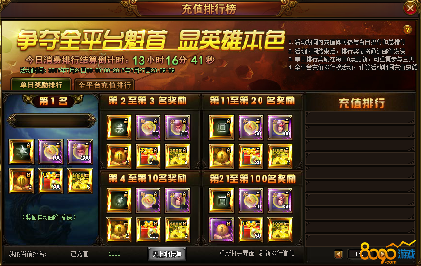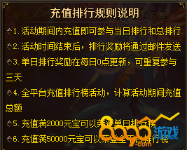 1. 活动期间内充值即可参与当日排行和总排行