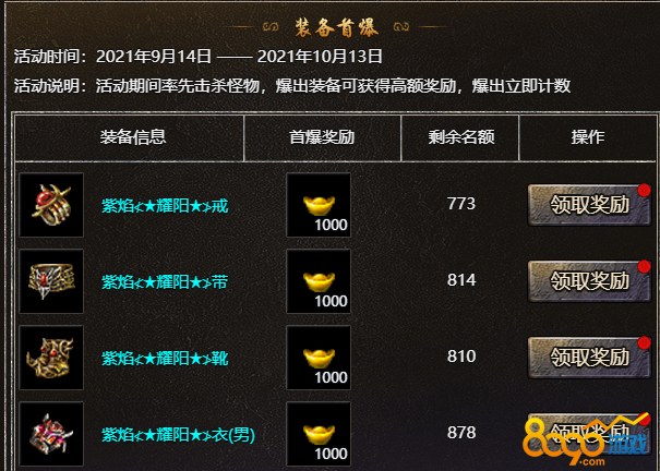 【活动内容】:活动期间率先击杀怪物,爆出装备可获得高额奖励,爆出立即计数,看谁白嫖的奖励最多!