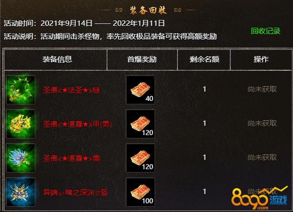 【活动内容】:活动期间击杀怪物,率先回收极品装备可获得高额奖励!