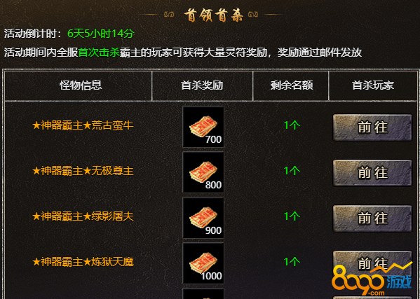【活动内容】:活动期间内全服首次击杀霸主的玩家可获得大量灵符奖励,奖励通过邮件发放。