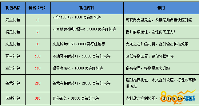 礼包共有7个:元宝礼包、精灵礼包、火龙礼包、冥王礼包、幸运礼包、苍龙礼包、面纱礼包。分别为:18元、58元、88元、108元、168元、268元、368元。