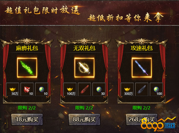 玩家可花费268元购买 攻速 礼包 ,可额外增加人物攻速400,杀人越货不可缺少的利器。